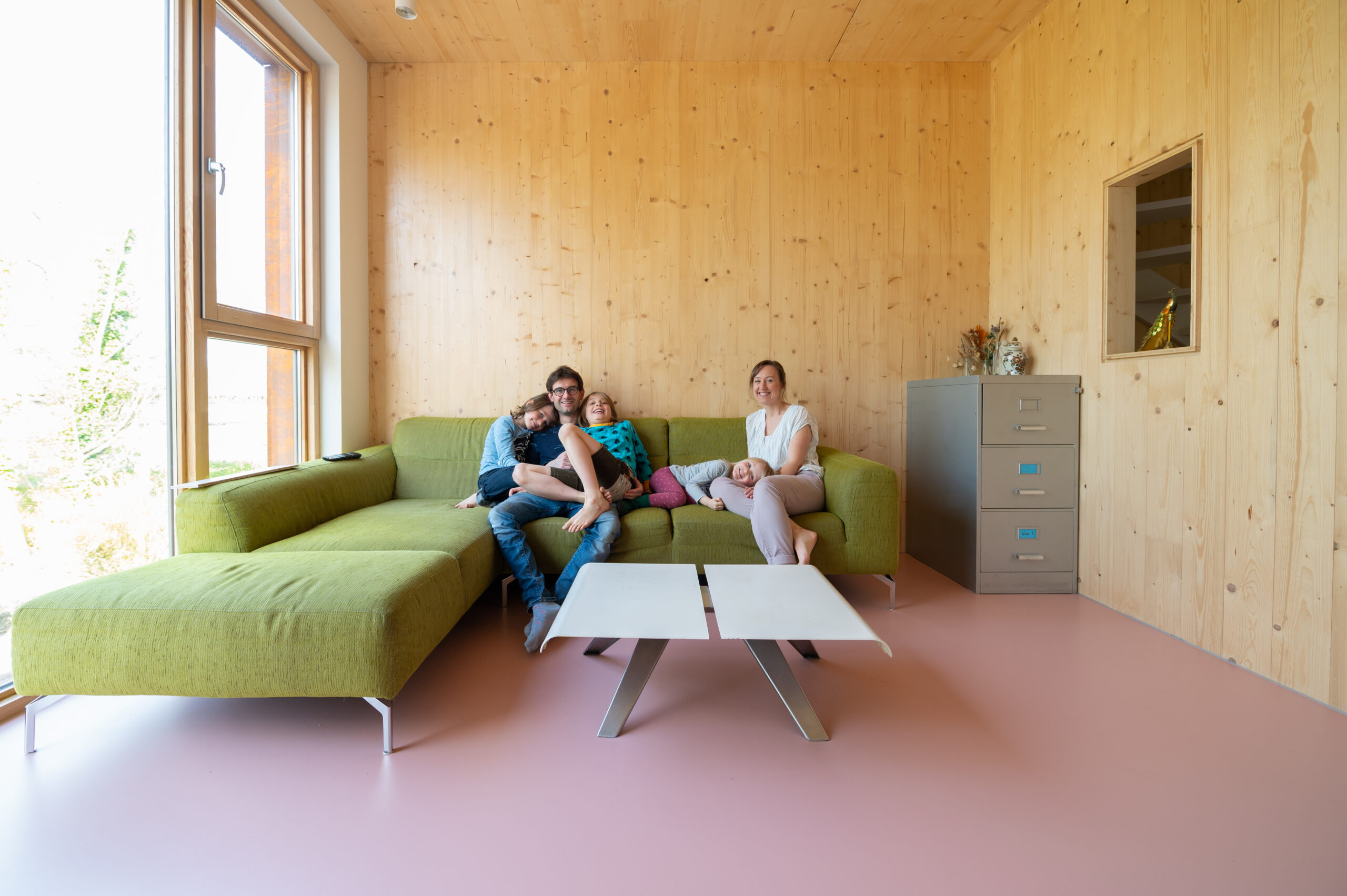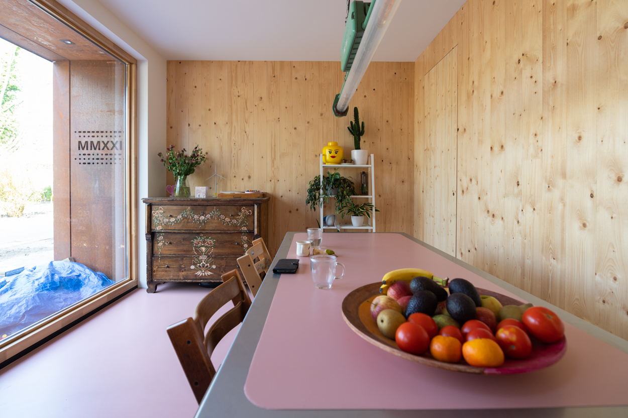 Hoe bevallen de eerste maanden in hun nieuwe huis? “Ja, heerlijk”, zegt Iris. “Door de warme uitstraling van het hout voel je je heel snel thuis. Het hout zorgt ook voor een heel prettig binnenklimaat. Onze twee jongens hebben allebei last van huisstofmijtallergie, maar hier hebben ze veel minder klachten.” Het enige is, moet ze toegeven, het huis is wel vrij gehorig. “Dat heeft de architect ook verbaasd. Het galmt zelfs een beetje. Maar we zijn ook nog niet helemaal klaar met de inrichting, hè? We gaan nog gordijnen ophangen, dat zal waarschijnlijk wel schelen.”De zachtroze gietvloer zal ook een bijdrage leveren aan de akoestiek. En aan de eerder benoemde warmte van het huis. De kleur matcht prachtig met het hout van de wanden, dat grotendeels zichtbaar is gelaten, en het donkergroen van de keukenkastjes. De vloerverwarming, door stroom voorzien door de zestien zonnepanelen op het dak, houdt de temperatuur comfortabel op peil. Te veel warmte zal misschien eerder een probleem gaan vormen in het huis met de grote ramen? “We kunnen ook koelen via de vloer, dus dat zal wel loslopen”, verwacht Joep.