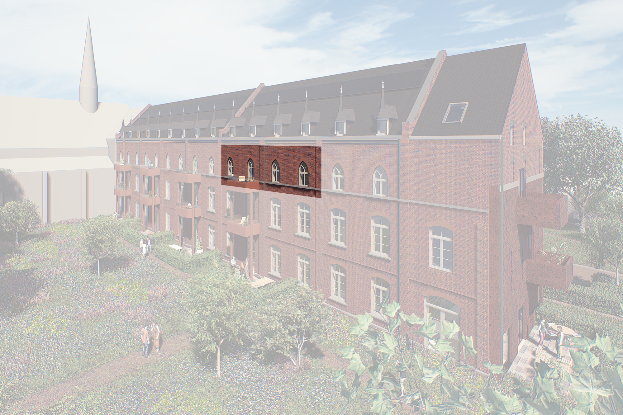 Maak een praatje met je buurtgenoten in de nieuwe, groene kloostertuin die door de VvE wordt aangelegd. Om de relatie met de buurt te versterken wordt de kloostertuin die aan het gemeentelijke park grenst, semi-openbaar gemaakt. De woningen op de begane grond krijgen ieder een stuk kloostertuin als privé tuin.